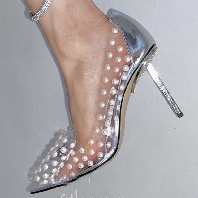 ビッグサイズブライダルセックスラインストーンダイヤモンド女性ハイヒール先のとがったつま先ファッションヒール透明ガラスPvcクリアヒールサンダル